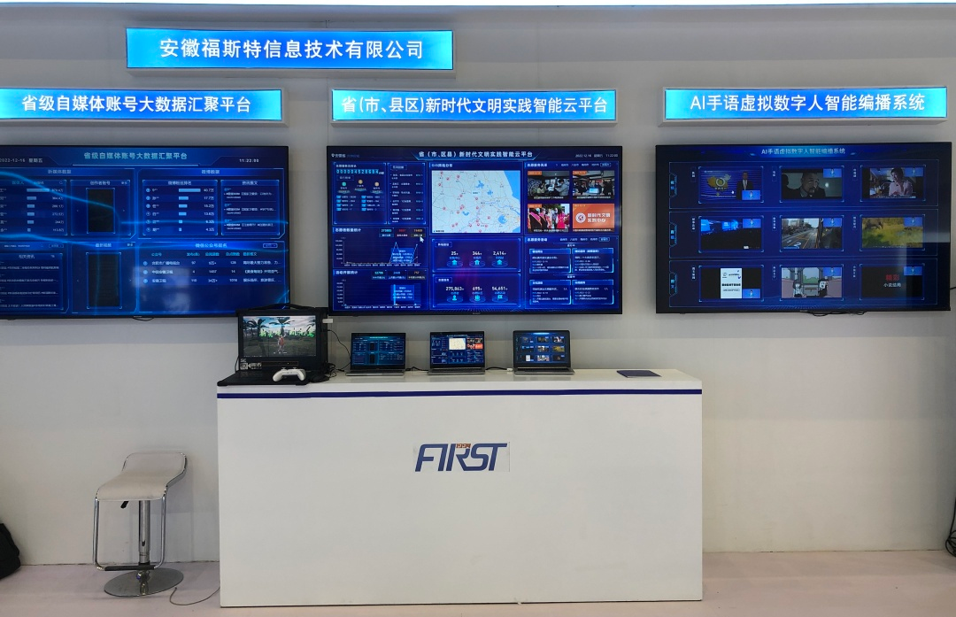 安徽福斯特信息技術有限公司此次應邀參展,以廣電媒體發(fā)展為亮點,集中展示大數據、人工智能呈現(xiàn)了AI-VLOG視頻智能合成系統(tǒng)+AI手語虛擬數字人智能編播系統(tǒng)+省級自媒體賬號大數據匯聚平臺+省(市、縣區(qū))新時代文明實踐智能云平臺技術。
